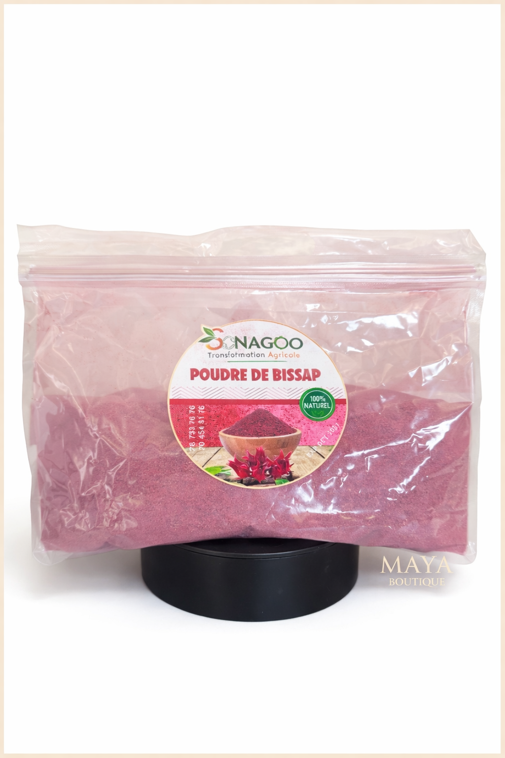 La poudre de bissap, obtenue à partir des fleurs d’hibiscus séchées et finement moulues, est très appréciée pour sa couleur intense, son goût acidulé et ses nombreuses vertus.