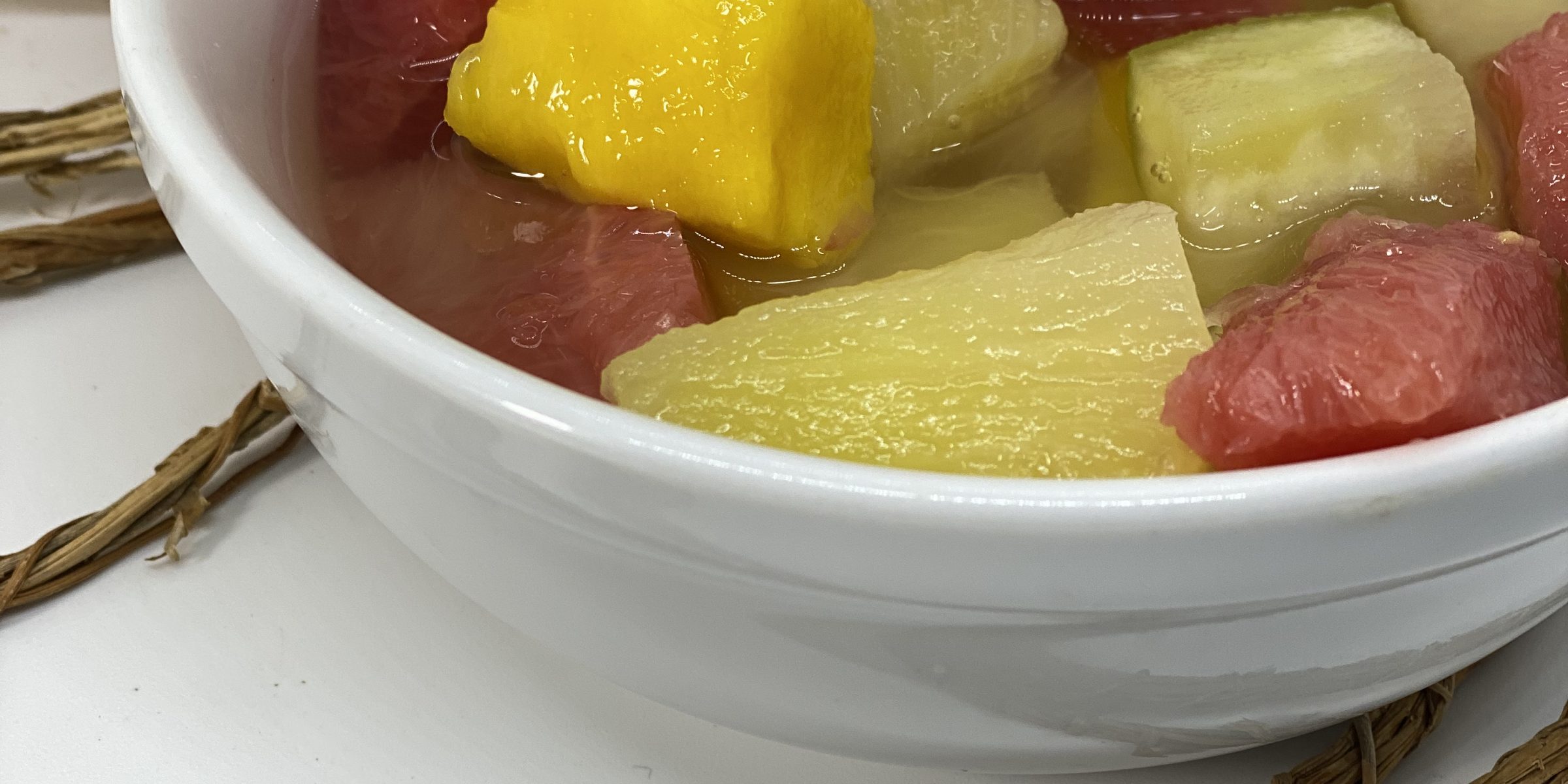 Trempez 4 tiges de vétiver de préférence toute une nuit dans du jus de fruit de votre choix, pour notre salade de fruit on a utilisé du jus d’ananas Découpez les fruits de votre choix, mélangez avec votre jus